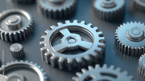 Collection of metal gears on a gray backdrop with selective focus