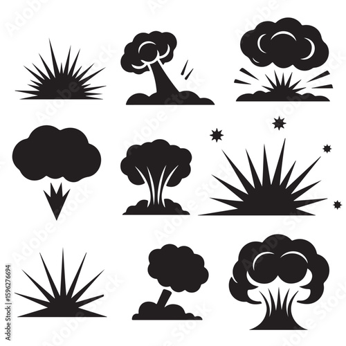 Collection of nine black and white explosion icons depicting various stages and styles of blasts