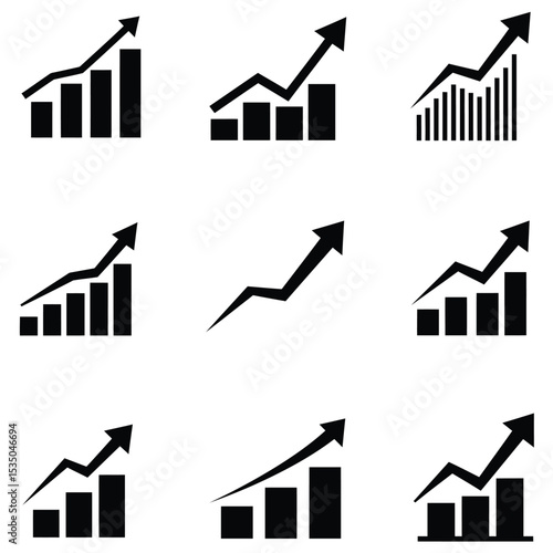 Collection of nine black and white growth trend icons illustrating business success and financial progress on a white background