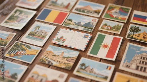 Collection of postcards featuring various flags and landmarks on a wooden surface