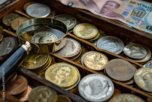 Collection of rare and valuable golden silver currency coins ai generative