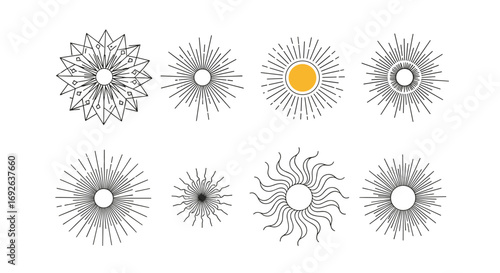 Collection of retro style sunburst starburst and abstract geometric design elements with ornate rays emanating from a central circle