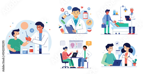Collection of scenes with doctor and patient activities illustration. Trendy vector style
