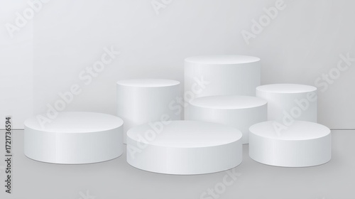 Collection of seven white cylindrical display pedestals on a gray floor cylinders geometric