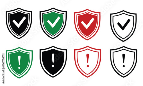 Collection of shield icons with checkmarks and exclamation marks