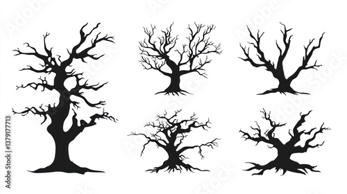 Collection of Silhouettes of Bare Trees, Autumnal or Winter Trees, Nature Illustrations, Graphic Design Elements