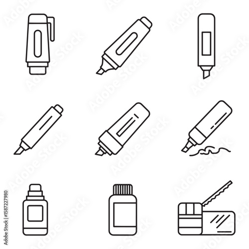 Collection of simple black outline marker pens and stationery supplies illustration for design concepts