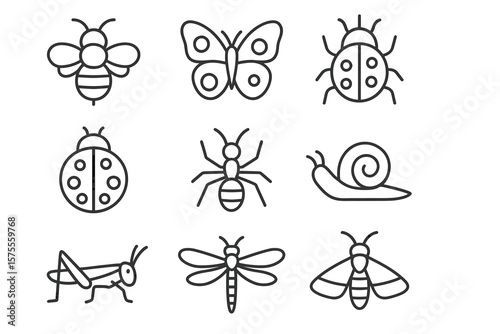 Collection of simple insect icons including bee, butterfly, ladybug, ant, snail, grasshopper, dragonfly, moth