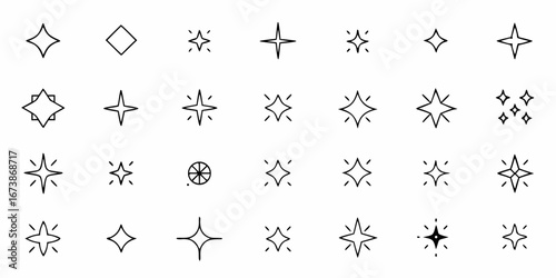 Collection of simple line art starburst and sparkle icons on a white background