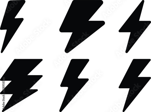 Collection of six unique lightning bolt vector shapes in black color