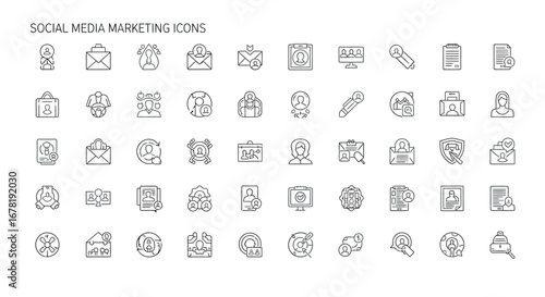 Collection of social media marketing elements displayed as line art on white, representing online communication and brand building, clean and modern.