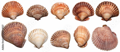 Collection of ten scallop shells isolated on white background, showcasing variations in color and shape.