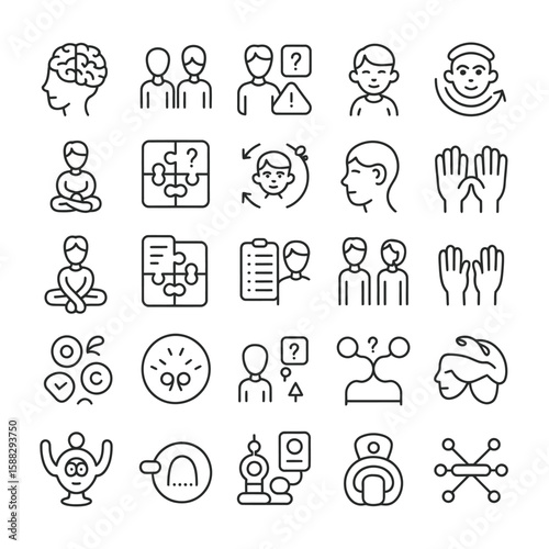Collection of Thirty Black Linear Icons Depicting Human Psychology Cognitive Processes Teamwork Problem Solving and Communication Concepts