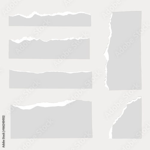 Collection of torn paper edges, featuring various shapes and sizes. Torn paper textures for creative designs. Torn paper adds a unique, textured look. Gray element vector set.