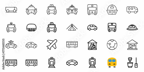 Collection of transportation and travel icons including cars buses and trains in simple line art style