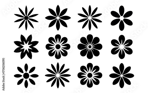 Collection of Twelve Black Flower Silhouettes in Various Styles Vector Art for Graphic Design and Creative Projects