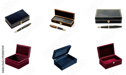 Collection of velvet box resting on a high-end desk, with elegant stationery and a fountain pen beside it. isolate on transparent background
