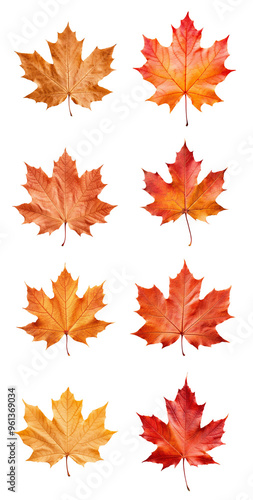 Collection of vibrant autumn maple leaves in various shades of red, orange, and yellow, isolated on a white background.