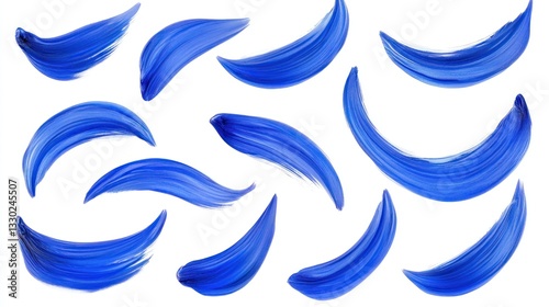 Collection of vibrant blue paint strokes, isolated on white background. Various shapes and sizes