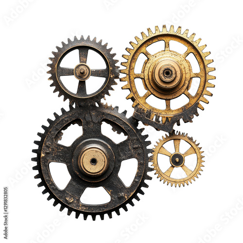 Collection of vintage gears arranged on a white background showcasing mechanical design, gears isolated on white background
