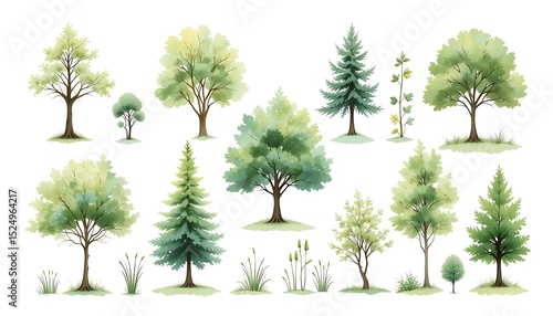 Collection of watercolor tree illustrations in various shapes and sizes with grass elements. Ideal for nature-themed designs, seasonal graphics, and botanical art resources.