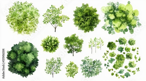 Collection of watercolor treetop views. Ideal for landscape design, architecture, or illustration projects.