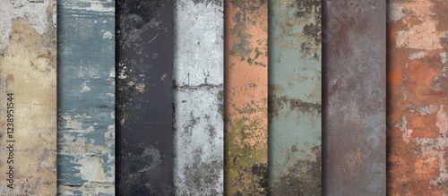 Collection of weathered and textured metallic surfaces in various colors and patinas arranged in a symmetrical layout with Copy Space