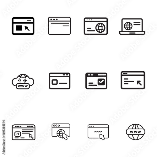 Collection of Web Browsing and Online Activity Icons This set of nine simple line icons depicts various web browsing activities, including website windows, a laptop, cloud storage, and different inter