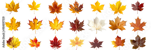 Collection set of yellow orange red maroon autumn fall maple leaf leaves on withe background cutout. Many different desig