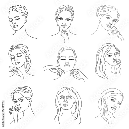 Collection. Silhouettes of a girl's head in a modern one line style. Continuous line drawing, aesthetic outline for home decor, posters, wall art, stickers, logo. Vector illustration set.