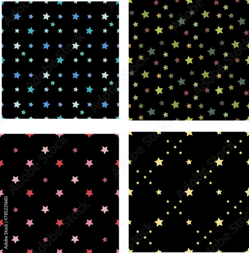Collection with seamless patterns with creative stars on black background. Vector image.