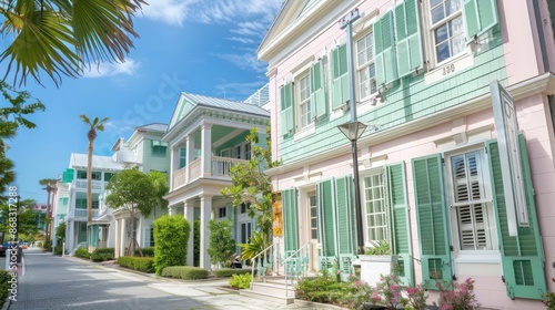 colonial townhouse with pastel green Bahama shutters, adding a touch of historic charm to the modern city