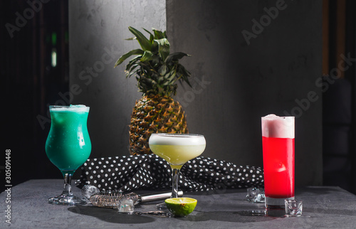 Color alcohol cocktails in bar. Black background