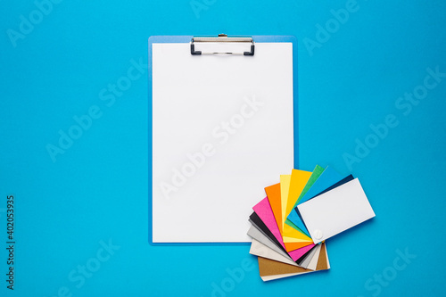 Color palette of paints and clipboard with blank paper for text on a light blue background. Banner. Top view, flat lay