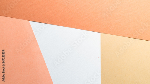 Color papers geometry shape composition background with white beige copper and brown color tones. Minimalism geometric flat lay backdrop. Top view