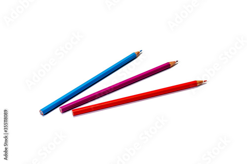 Color pencils 3 pieces of blue, purple and red laid out on a white background. Isolate.