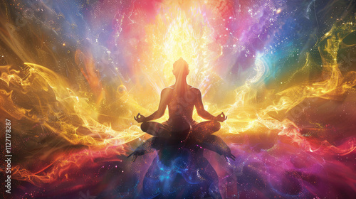 Colored Aura of a Man Silhouette in Lotus Position Meditating, Connected with Everything Illustration