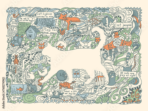 Colored doodle illustration on the theme of cats. Drawing for packaging, interior, napkins, post cards