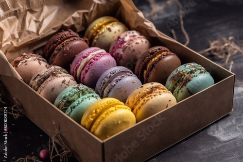 Colored macaroons in a wooden box. Gift Macarons. Copy space. Generative AI.
