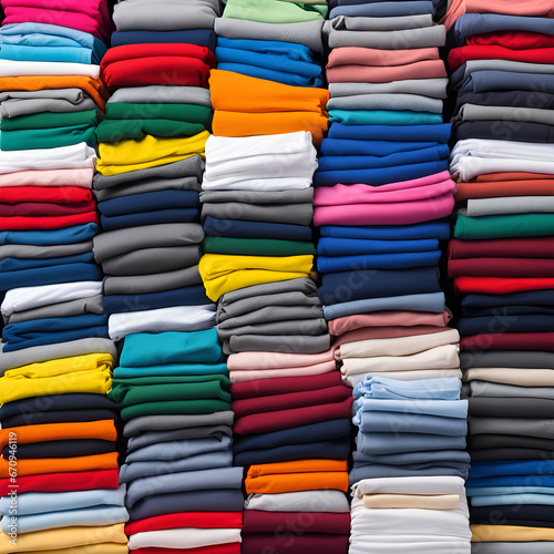 Colored multi-colored T-shirts lie in a stack.