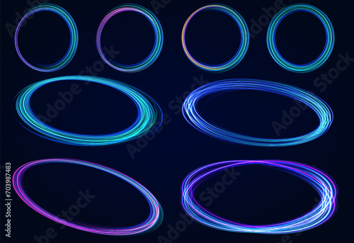 Colored neon ovals or circles for swirl shiny rings light effect. Glow luminous glitter shimmer trail. Curve light effect of multicolored line. Blurred spiral ring. Bokeh effect. Vector illustration.