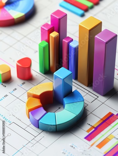 Colorful 3D bar and pie charts illustrating growth and data analysis. illustration