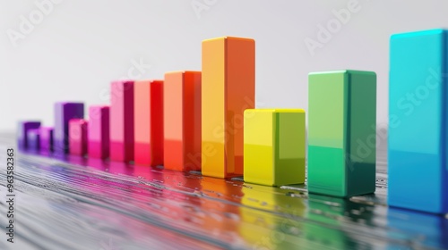 Colorful 3D bar chart on a reflective surface, representing growth and progress in business analytics.