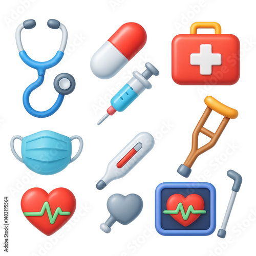 Colorful 3d icon set of y2k healthcare symbols featuring medical equipment and supplies