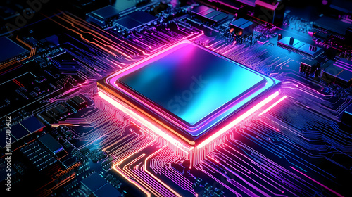 Colorful 3D illustration of a futuristic motherboard with a CPU at its center, connected by holographic circuits