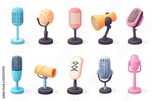 Colorful 3D Microphone Icons and Objects Collection in Cartoon Minimal Style on Transparent White