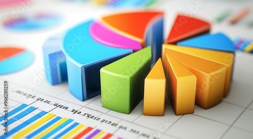 Colorful 3D pie charts and bar graphs depicting data analysis and visualization in a business report