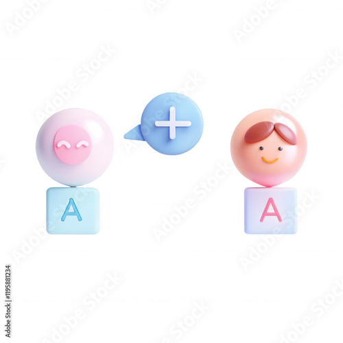Colorful 3D render of playful minimalist characters with circular heads, feature expressive faces, set beside lettered blocks, promoting creativity.