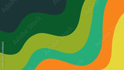 Colorful abstract background with layered wavy shapes in retro style, featuring bold greens, oranges, and yellows for creative and eye-catching design projects.