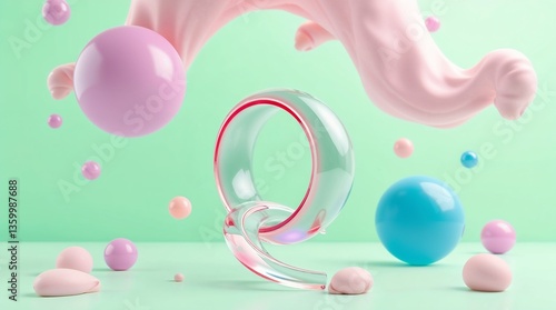 Colorful abstract composition with a transparent ring and floating spheres on a pastel background